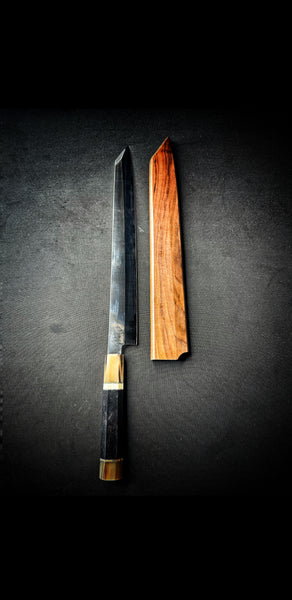 13 inch sashimi blade. Longer blade for easy sashimi break down. Heavy weight, high grade steel, black resin handle with gold inlay and magnet wood sheath.